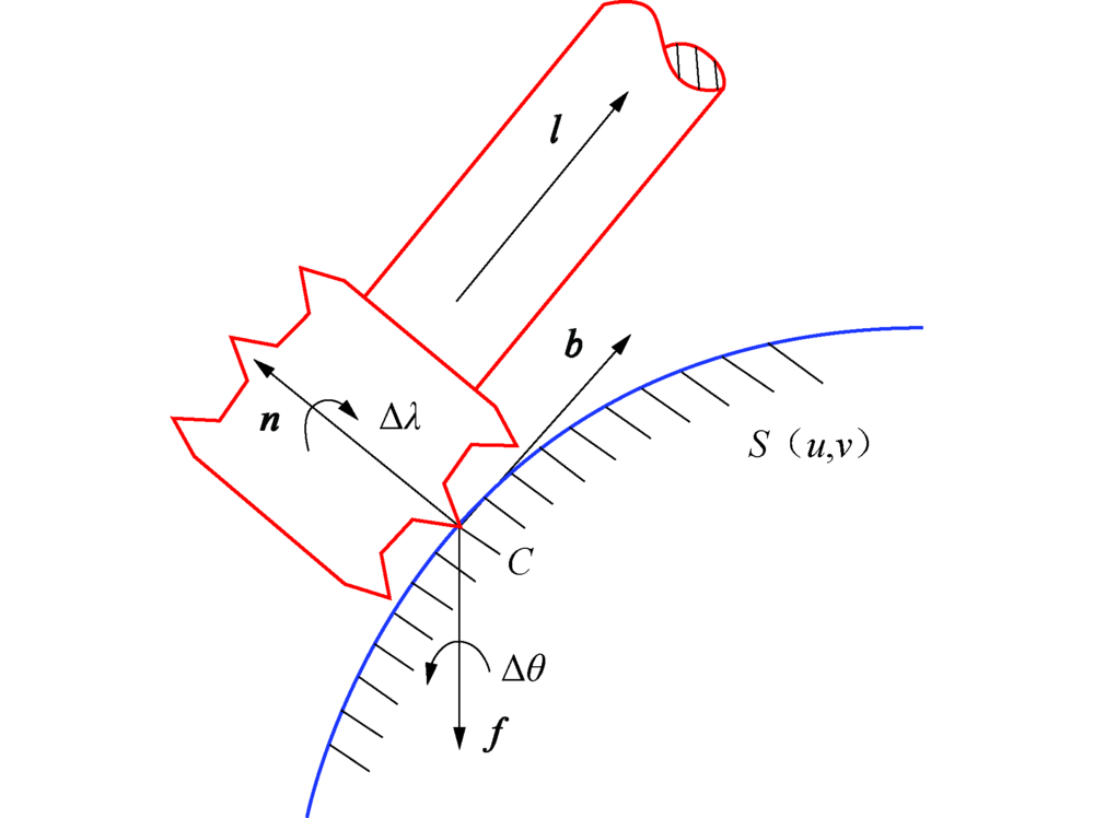 利用多齿鼓形刀侧铣微结构的示意图如图2所示, 其中S(u, v)为待加工曲面, C点为刀触点, n为刀触点处的单位法矢, l为刀轴的单位刀轴矢量, f为切削方向, 矢量b=n× f与f、n共同组成了C点处的局部坐标系.刀轴矢量的初始方向l规定与b一致, 然后分别调整前倾角λ 绕n旋转角度Δ λ , 侧偏角θ 绕f旋转角度Δ θ , 找到满足加工要求的刀位姿态.