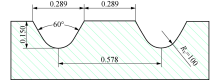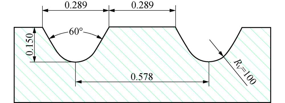 要加工的space-V型微结构见图5, 微结构槽深t=0.15 mm, 槽宽s=0.289 mm, 槽间距l=0.578 mm, 微沟槽两侧面夹角η '=60° , 微沟槽底端圆角半径RV=0.1 mm.为了使待加工曲面上微结构沟槽分布均匀, 且达到设计的间距要求, 需要保证走刀行间距固定不变.