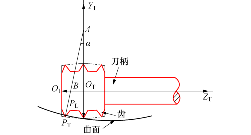 已有数据点为叶片曲面上的型值点PL, 而为了在叶片曲面上加工出固定深度的微沟槽, 刀触点PT一般位于型值点PL以下一个沟槽深度t的位置, 如图9所示, OT为刀具刀位点, O1为刀具端面圆心, A为刀具鼓形圆弧的圆心, PT为刀具母线上任一点, B为刀轴矢量所在直线与APT的交点.