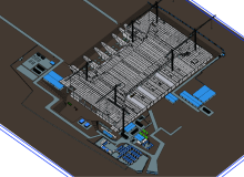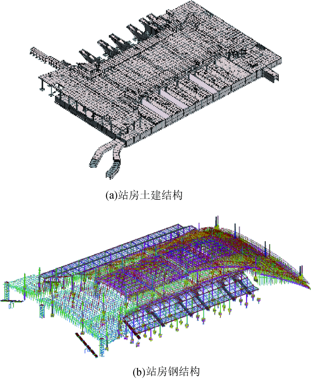 根据施工要求和BIM应用场景, 结合铁路BIM联盟发布的建模标准, 制定了BIM建模的技术要求, 并依据施工图纸完成了土建结构、钢结构、水暖电等专业模型建立, 同时为便于管理, 利用BIM设计成果管理系统, 实现BIM模型、设计图纸、相关附件的关联管理.其中, 建模技术要求包括:建模命名规则、工作集划分、系统命名及颜色显示、BIM模型LOD标准等, 同时各专业建模人员使用同一版本建模软件, 在同一坐标系中进行建模工作.其中站房主体结构、装修、暖通、消防等专业利用Revit完成建模工作, 站房钢结构利用Tekla建模, 部分下吊点模型转为Solidworks模型, 通过自主研发的轻量化工具和图形显示平台实现总装模型的可视化管理, 对需要进行力学分析的模型导入SAP2000和ANSYS中进行力学验算及分析, 完成各专业模型(见图2).