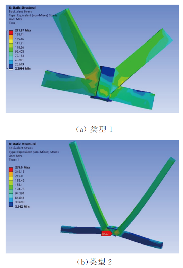 提升下吊点共计两种类型, 如图8所示.类型1为从圈形桁架上单独引出下吊点临时措施杆件设置下吊点, 最大反力为1 635 kN, 最大局部应力212 kN.类型2为设置在圈形补强桁架上, 最大反力为1 065 kN, 最大局部应力277 kN.使用Solidworks建模, 利用ANSYS Workbench进行有限元分析.经过综合验算, 下吊点最大局部应力277 MPa, 满足提升要求.