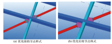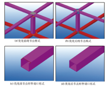 7)节点优化设计.钢结构施工往往存在“ 成也焊接, 败也焊接” , 设计人员在设计复杂、异形节点时, 应注意避免出现密集焊缝、相交焊缝的情况, 从构造、工艺的角度出发, 选取工艺流程简单、产生焊接残余应力较小的设计方案.节点优化是项目优化设计工作的重点, 优化设计工程师需与施工图设计人员密切配合, 相互交流, 使节点方案传力简洁、受力性能优异、制作简单.