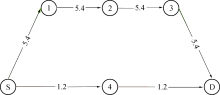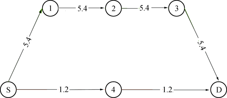 对于MANET网络, OLSR在建立路由时, 当数据包从一个节点传输到另一个节点时, 则认为经过一跳, 那么跳数越少, 端到端时延就会越少, 然而在无线网络中, 并不是跳数少的路由路径就是最佳的路由路径.举例如图1所示, 从源节点S到目的节点D, 跳数最少的路由路径为S→ 4→ D, 然而, 并不是最优路径, 因为S→ 4→ D路由路径的传输速率要低于S→ 1→ 2→ 3→ D路由路径, 跳数较多的路径反而最优.
