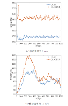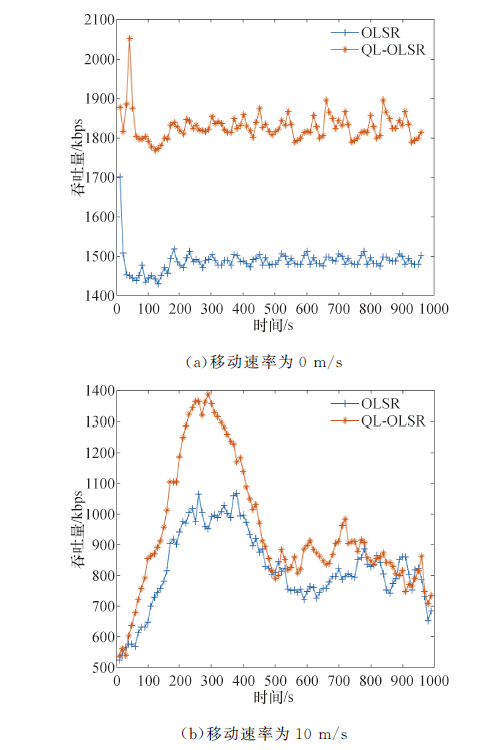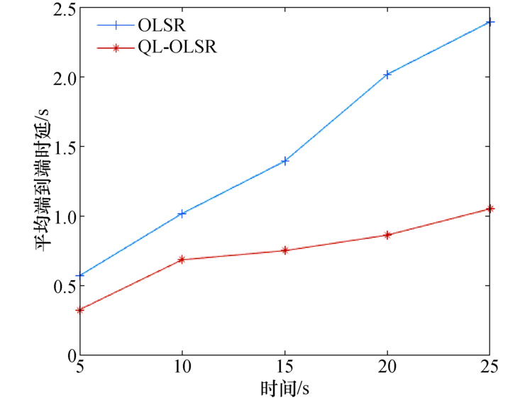 综上可得, 在网络拓扑变化快的场景中, OLSR协议的路由在建立的过程中, 由于节点的移动速度过快, 导致节点建立路由的时间更长, 所以端到端延迟更大; 而QL-OLSR中采用了Q-Learning的思想, 网络会选择链路容量高的路由, 在保证节点稳定性的情况下建立合适的路由, 从而保证了网络有更好的性能、更低的时延、更高的吞吐量.