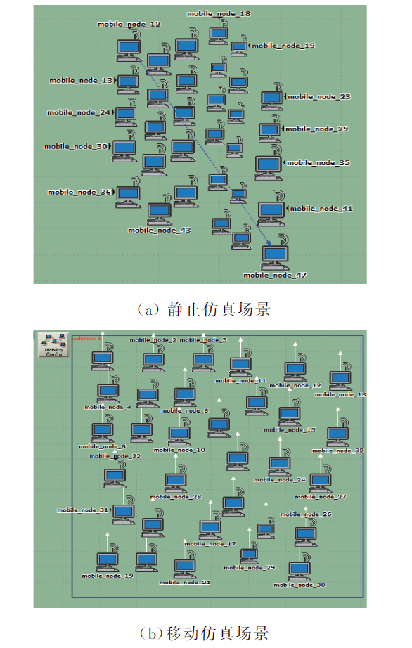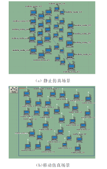 实验安装的OPNET16.0已经实现标准版的OLSR路由协议的软件包, 设置仿真参数如表2所示, 构建的仿真场景如图4所示, 使用IP业务流进行测试, 分别在静止和移动两种场景下对网络性能进行分析评估.