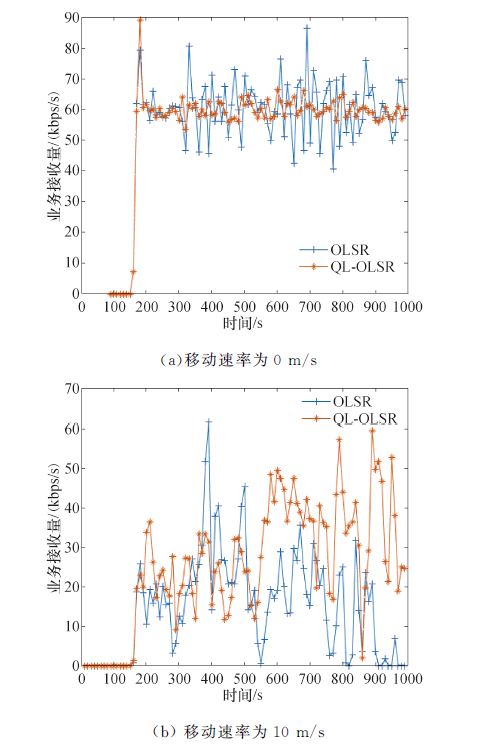 业务接收量如图9所示, 可以看出, 在静止的环境下(节点移动速率为0 m/s), QL-OLSR和OSLR两种协议的业务接收量差不多一致, 这是因为此时网络拓扑的变化情况不是很大.但是当节点移动速率增加时(节点速率为10 m/s), 两种协议的业务接收量就有了差距, 可以得出, QL-OLSR的业务接收量优于OLSR协议, 此时节点移动速率快, 网络拓扑变化快, 所以在接收业务时就需要更多的时间, 当信道堵塞时, 包就无法传输到目的节点, 从而造成包丢失的情况, 而QL-OLSR可以快速适应网络拓扑变化的过程, 故会有更小的丢包率, 更高的业务接收量.