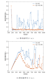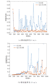 可以得出:不论在静态场景还是在节点移动速率为10 m/s的情况下, 改进后的路由策略的网络更加稳定, 端到端时延也更低, QL-OLSR的时延抖动更小, 更加适应拓扑变化快的网络.